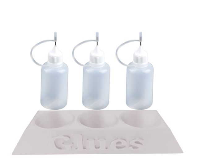 3 x 30ml refillable fine tipped glue bottles included. (Glue not included)
